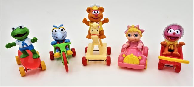 1986 Muppet Babies Kermit on skateboard, Gonzo on trike, Fossie on rocking horse, Animal in cart, |