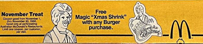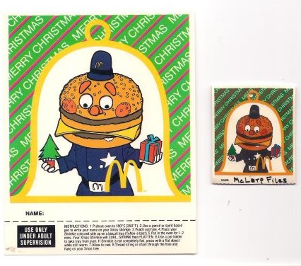 The Christmas Name Tag Shrinkies, measuring 11cm wide and 13 cm high featuring early McDonald characters, were the November 1986 Calendar Treat.