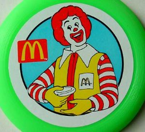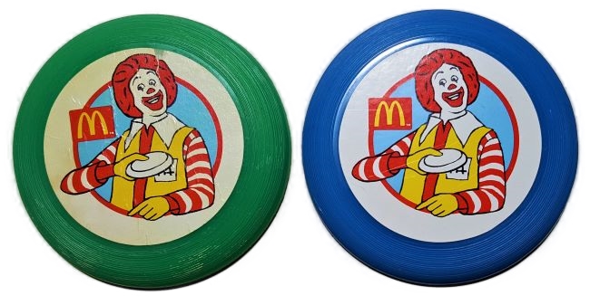 Plastic Mini Frisbees, measuring 9cm diameter, were generic toys used between 1992 and 1994.